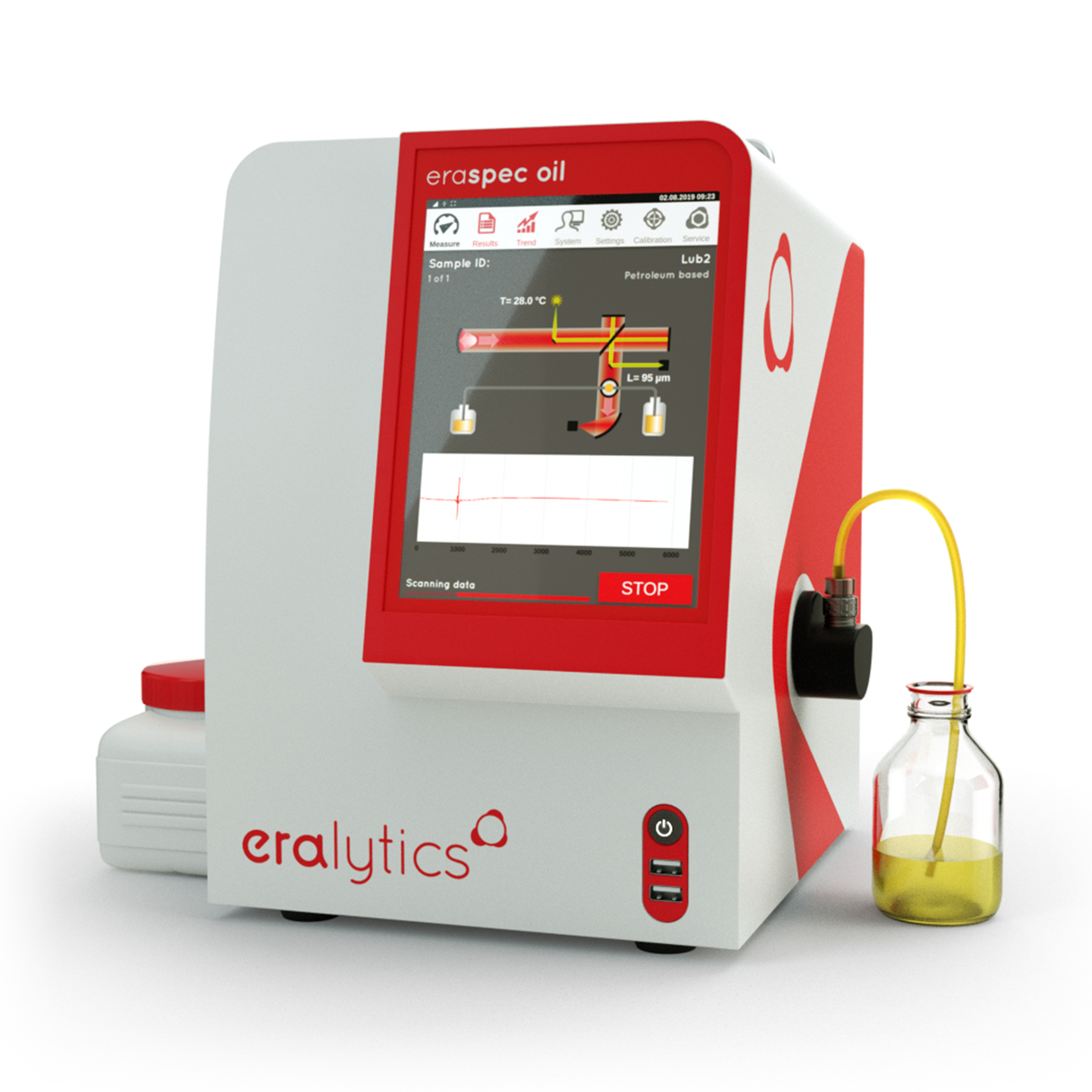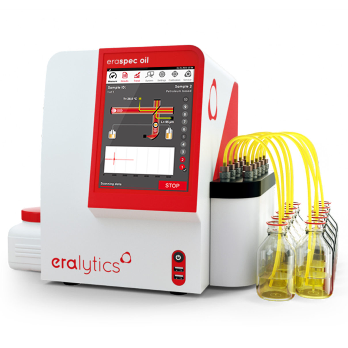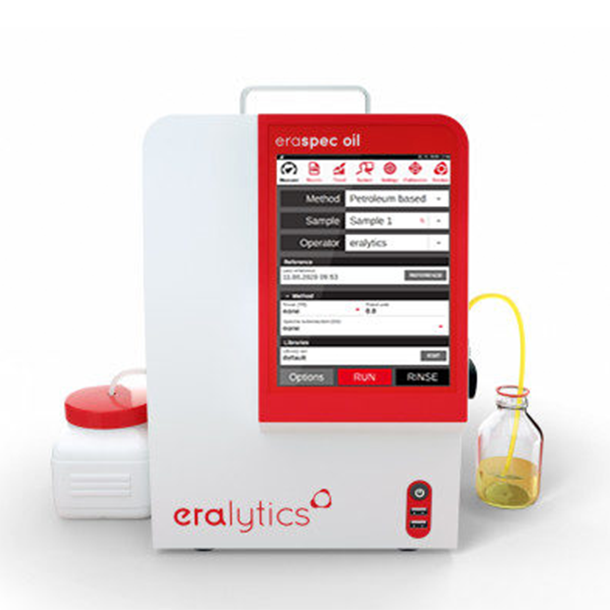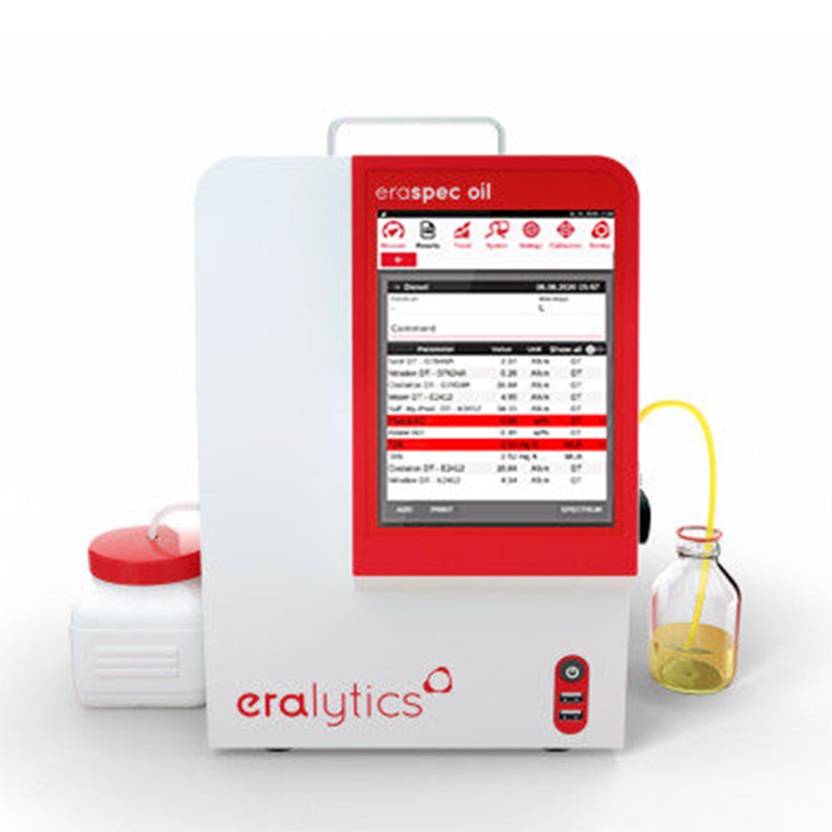 ERASPEC OIL is a portable infrared analyzer designed for high-speed lubricant oil analysis and condition monitoring. It complies with ASTM, DIN, and JOAP standards, providing laboratory-grade results on-site. This innovative device measures contaminants, degradation products, additive depletion, and calculated properties like TAN, TBN, and viscosity within seconds. With patented interferometer technology, it offers reliable performance and accuracy.