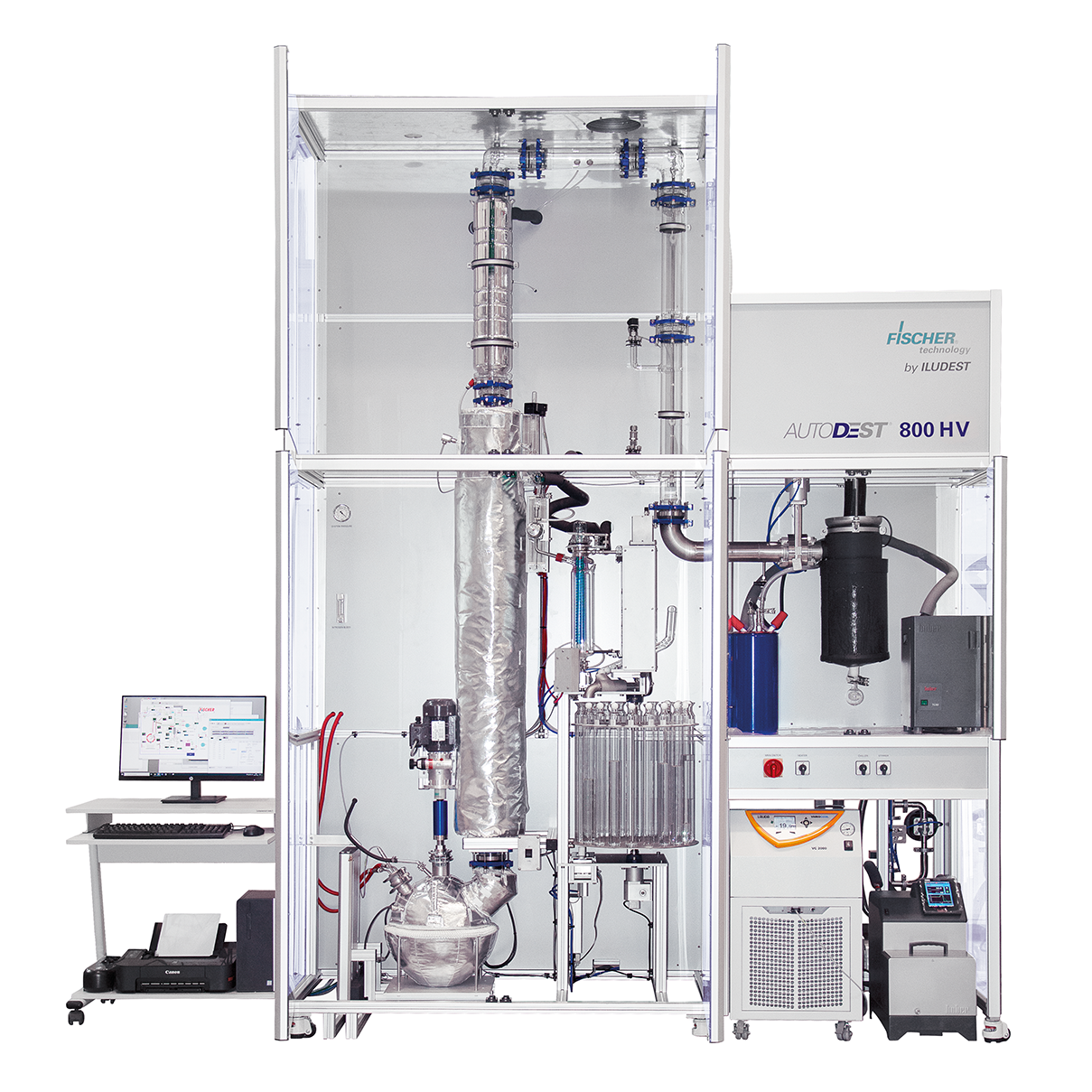 Fully Automated/Computerized Distillation System for fractionating of crude oil samples, atmospheric residues resp. vacuum distillations of lubricating oil samples up to very low operation pressure (high vacuum HV: Operation pressures down to 0.005 mmHg, allowing fraction temperatures up to 600 °C AET). The unit is equipped with an automatic fraction collector (FC) and combined automatic fraction discharge into final receivers, which are closed automatically. The fraction volumes and weights are determined by built-in volume follower system and internal balance (included software “FC-Extension” allows to operate very narrow fractions by using max. 40 receivers).