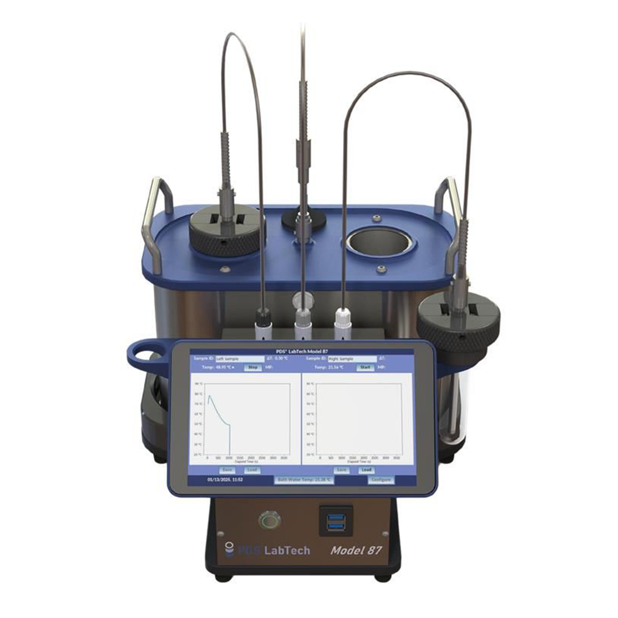 The LabTech Model 87 is a fully automated instrument for determining the melting point of petroleum, paraffin, or scale wax using the cooling curve method, in compliance with ASTM D87. It features dual test cells in a removable bath for higher throughput and calibrated RTD probes, eliminating the need for mercury thermometers. The system is fully automated, from sample insertion to results, and offers a simple touchscreen interface with visual and audible test status indicators. Results can be stored and exported via USB ports. The included wireless keyboard with touchpad enhances ease of use, and the system reduces operator variability, providing an economical and efficient solution for wax melting point testing.