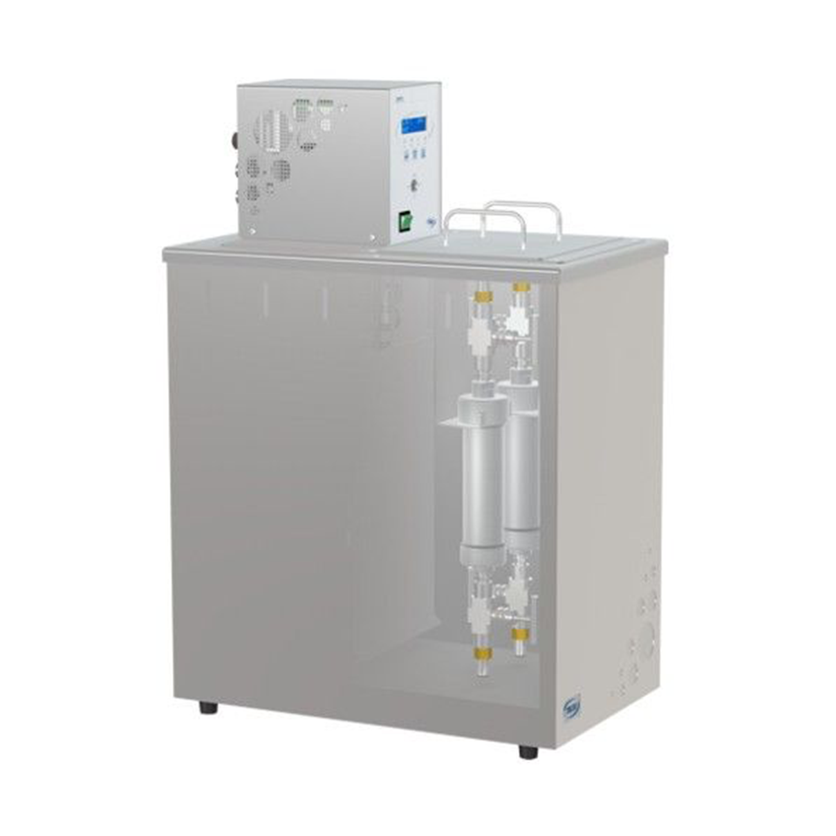 The TB30 bath is designed for testing the corrosiveness of liquefied petroleum gases on copper, in compliance with ASTM D1838, IP 411, and ISO 6251 standards. It maintains a precise temperature of 37.8°C ±0.02°C without requiring an external cooling circulator, with a built-in cooling coil for high ambient conditions. The stainless steel bath accommodates four LPG corrosion test cylinders upright and includes two cylinder-holding lids.